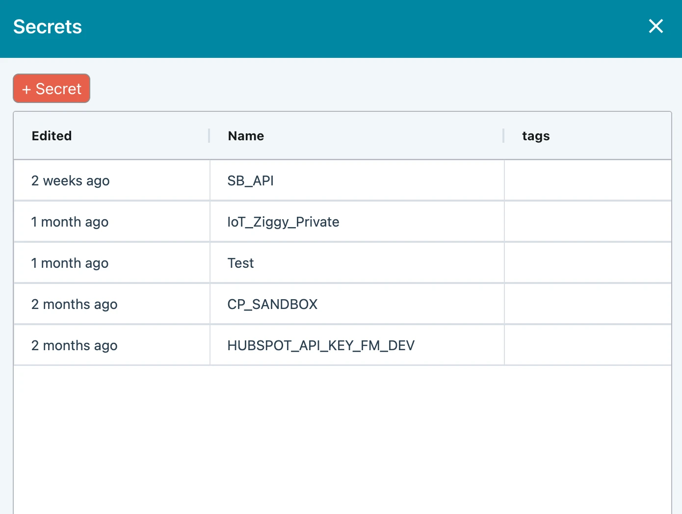 Store and manage your secrets, fully encrypted, in Ziggy and reference from your flows. You can optionally configure a development/production pair.