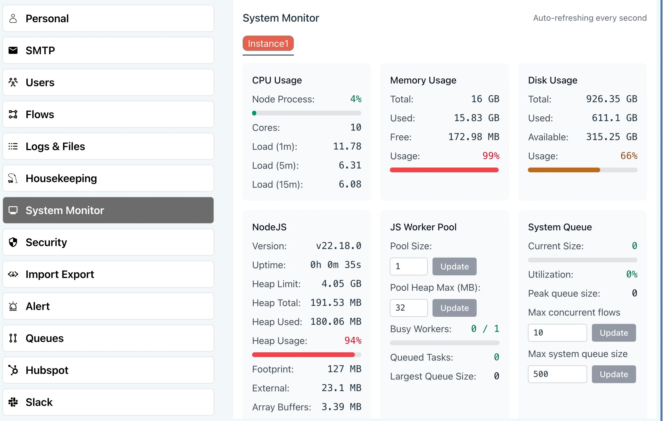 Ziggy has two monitoring screens. One shows currently executing flows and another for key server resource levels (shown).