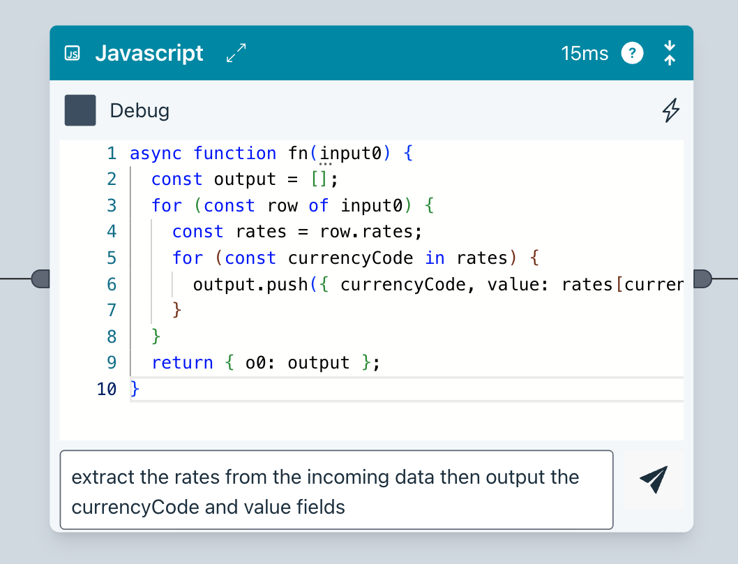 Ziggy will generate code from your instructions. It also understands the data in your flow to ensure it has the full context.