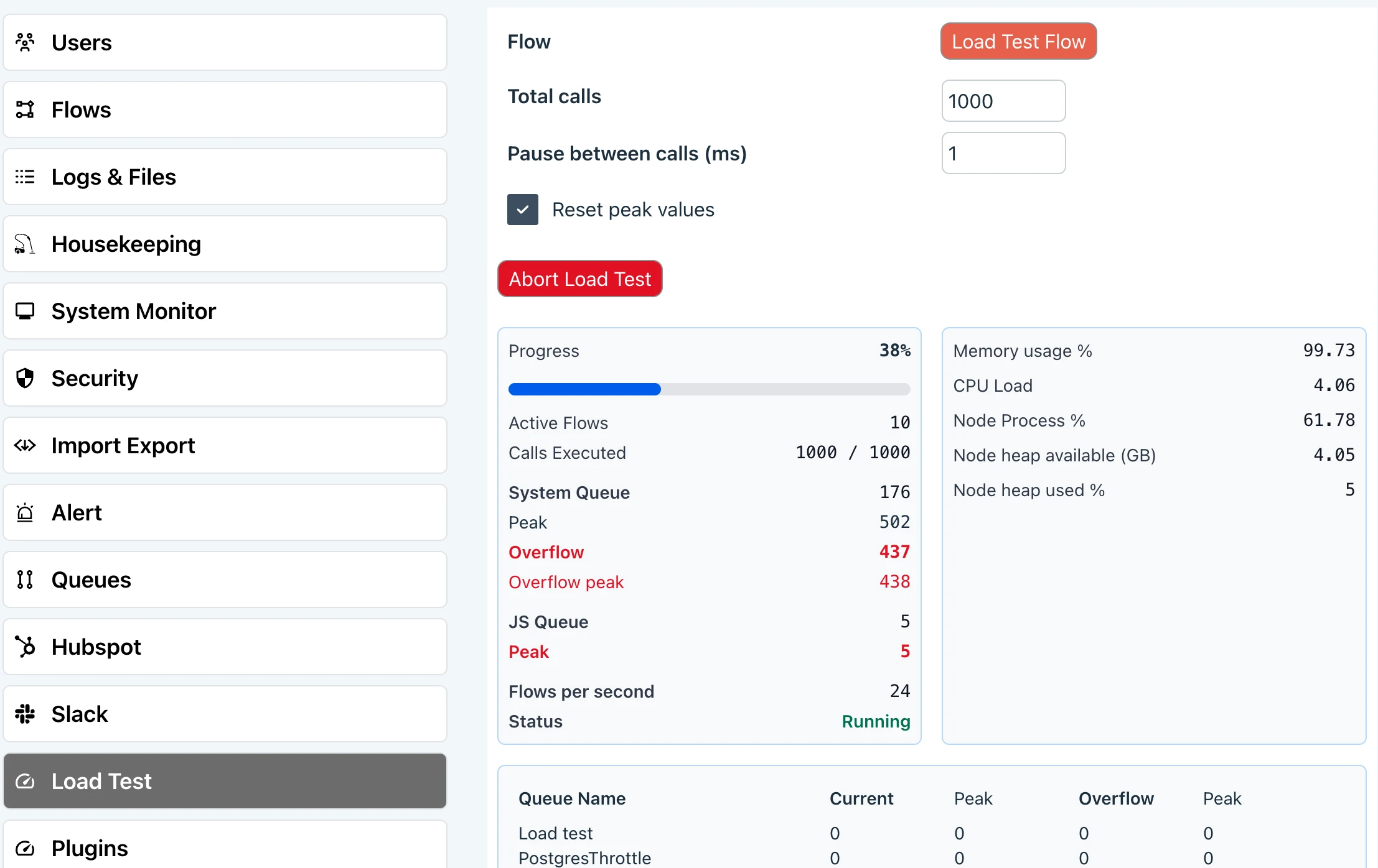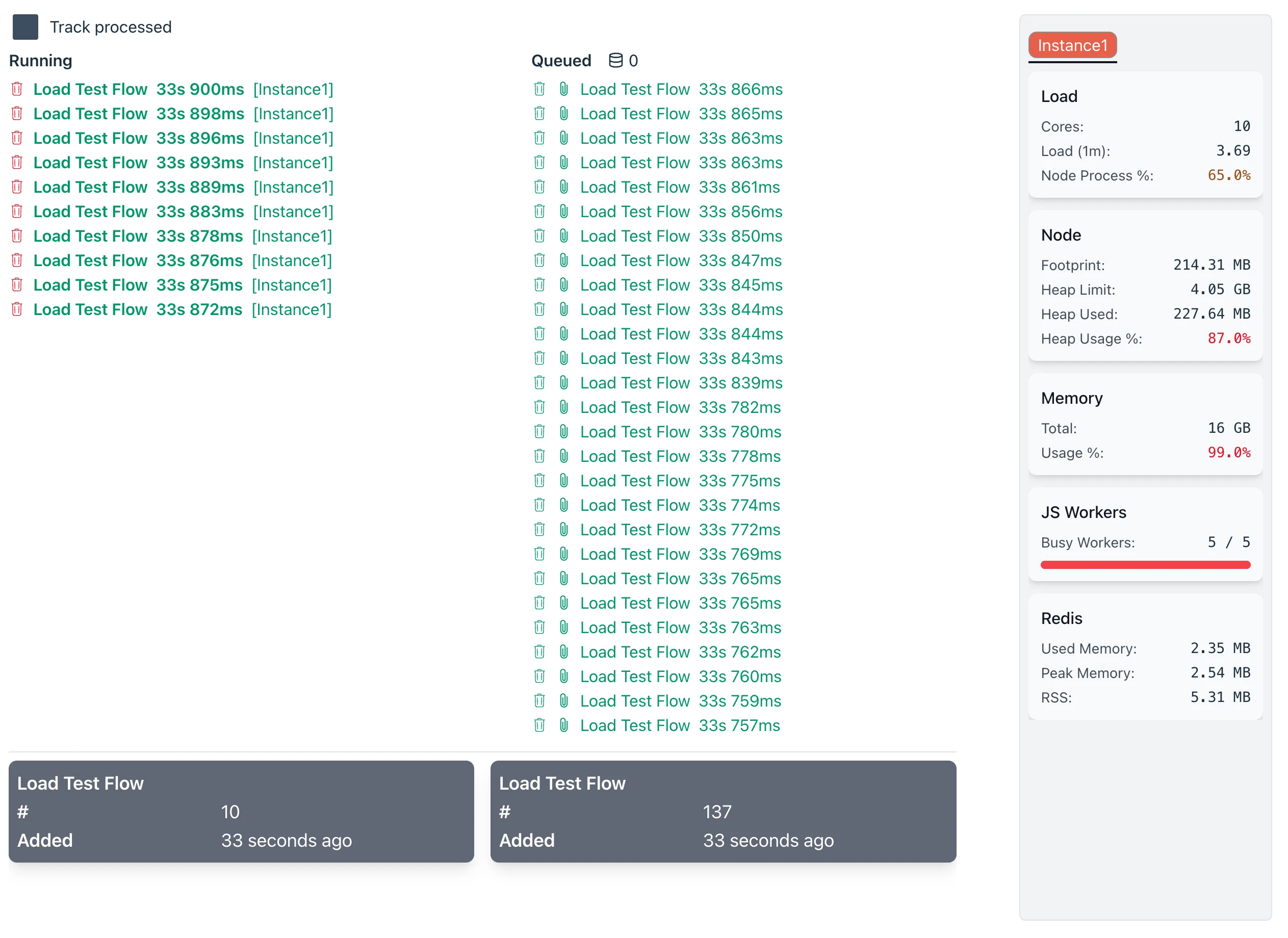 Tune number of parallel executing flows, system queue sizes, Javascript worker pool size. Then use the load tester to see the results. Rinse and repeat.